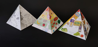 Das Bild zeigt drei Pyramiden aus Papier. Es gehört zur Serie "Ernährungspyramide zum Basteln und Gestalten" und findet u.a. im gleichnamigen Lernobjekt unter https://www.schulportal-thueringen.de/web/guest/media/detail?tspi=18517 Verwendung. Es gelten die Nutzungsbedingungen der Mediothek und Pixiothek.