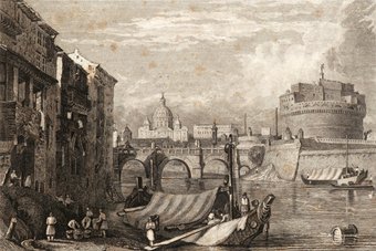 Die Abbildung zeigt einen Blick über die Tiberbrücke auf die Engelsburg (Castel Sant'Angelo), die Peterskirche und den Vatikan in einer historischen Ansicht. Das Bild stammt aus Band 1 von „Meyer's Universum oder Abbildung und Beschreibung des Sehenswerthesten und Merkwürdigsten der Natur und Kunst auf der ganzen Erde“, erschienen 1833. Das Digitalisat ist bei der Universitäts- und Landesbibliothek Düsseldorf unter https://nbn-resolving.org/urn:nbn:de:hbz:061:1-621229 abrufbar. Das Gesamtwerk wurde unter Public Domain Mark 1.0 Universell lizenziert, ist somit gemeinfrei und kann frei verwendet werden.