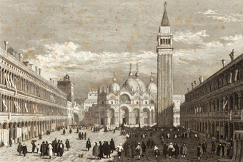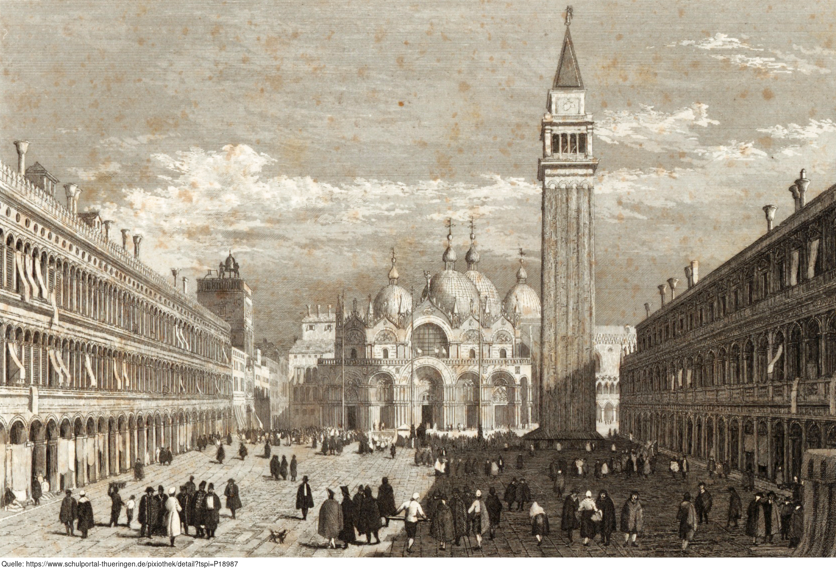 Die Abbildung zeigt den Markusplatz (Piazza San Marco) in Venedig in einer historischen Ansicht. Das Bild stammt aus Band 1 von „Meyer's Universum oder Abbildung und Beschreibung des Sehenswerthesten und Merkwürdigsten der Natur und Kunst auf der ganzen Erde“, erschienen 1833. Das Digitalisat ist bei der Universitäts- und Landesbibliothek Düsseldorf unter https://nbn-resolving.org/urn:nbn:de:hbz:061:1-621229 abrufbar. Das Gesamtwerk wurde unter Public Domain Mark 1.0 Universell lizenziert, ist somit gemeinfrei und kann frei verwendet werden.