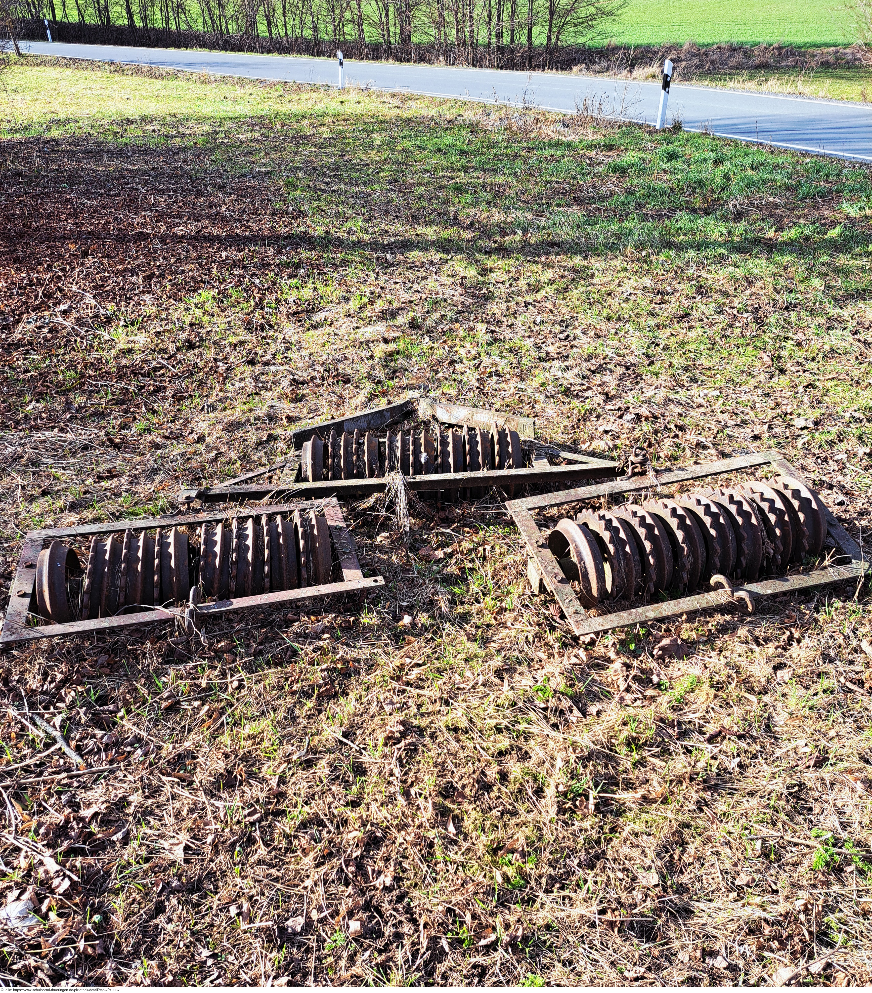 Das Foto gehört zur Serie "Landwirtschaft". Es zeigt eine landwirtschaftliche Ackerwalze, Cambridge-Walze oder einen Cultipacker. Sie dient zur Rückverfestigung des Bodens nach dem Pflügen oder Säen, um zu lockere Erde zu verdichten. Die Ringe zerkleinern dabei grobe Erdschollen und ebnen die Oberfläche ein. Das Bild ist unter CC0 lizenziert und kann somit frei verwendet werden.