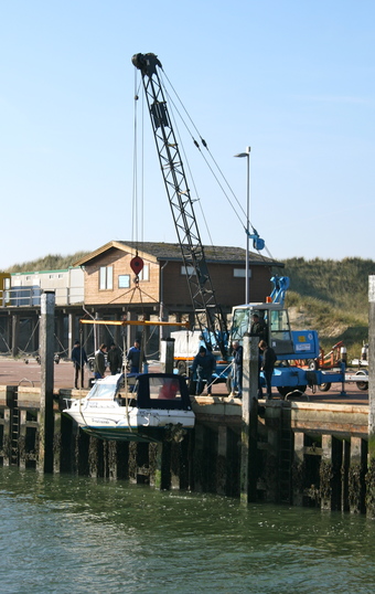 Wangerooge: Aufkranen eines Bootes im Hafen