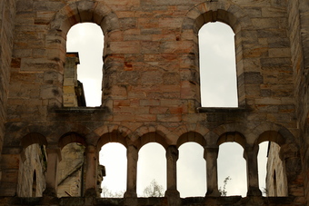 Das Foto gehört zur Serie "Klosterruine Paulinzella". Es zeigt Fensterbögen zur Vorhalle. - - Es gelten die Hinweis für Bilder mit Motiven von Stiftungsobjekten der Stiftung Thüringer Schlösser und Gärten: Es gilt grundsätzlich, dass die Bilder ausschließlich zur Bereitstellung für Unterrichtszwecke verwendet werden dürfen. Jede Art der darüber hinausgehenden Publikation der von einem Standort innerhalb der Stiftungs-Liegenschaften aufgenommenen Motive bedarf einer gesonderten schriftlichen Genehmigung durch die Stiftung Thüringer Schlösser und Gärten.