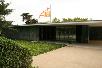 Das Foto gehört zur Serie "Deutscher Weltausstellungspavillon Barcelona 1929". Der deutsche Architekt Ludwig Mies van der Rohe entwarf diesen Ausstellungspavillon. Er gilt heute als Architekturikone des 20. Jahrhunderts. Das Bild zeigt die Rückansicht vom Pavillon. Es gelten die Nutzungsbedingungen der Mediothek und Pixiothek.