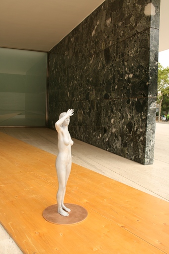 Das Foto gehört zur Serie "Deutscher Weltausstellungspavillon Barcelona 1929". Der deutsche Architekt Ludwig Mies van der Rohe entwarf diesen Pavillon. Er gilt heute als Architekturikone des 20. Jahrhunderts. Das Bild zeigt den Innenraum vom Pavillon mit der Skulptur "Der Morgen" des Künstlers Geog Kolbe. Es gelten die Nutzungsbedingungen der Mediothek und Pixiothek.
