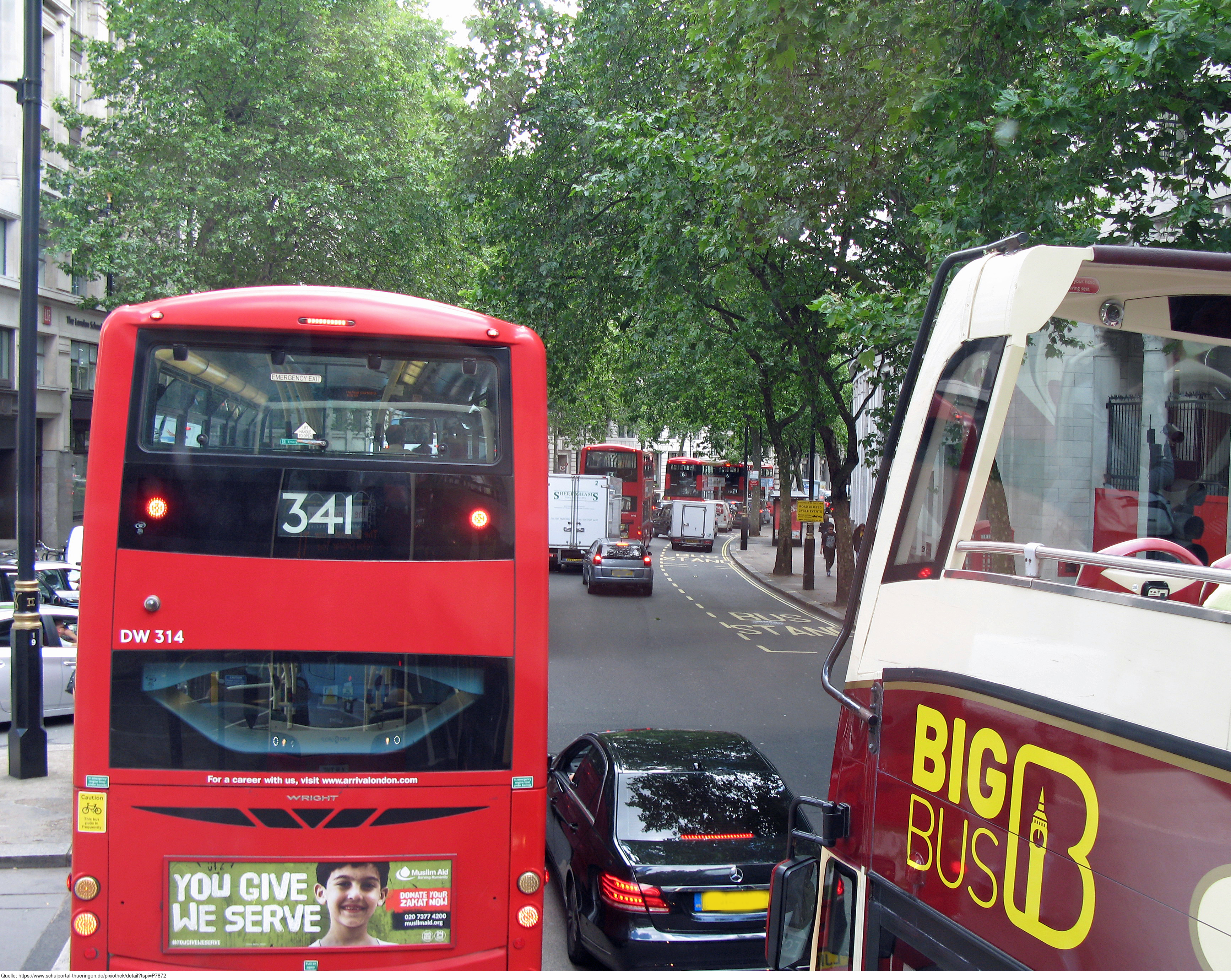 Das Foto gehört zur Serie London 2016. Es zeigt Straßenverkehr (traffic) in London. Es gelten die Nutzungsbedingungen der Mediothek und Pixiothek.