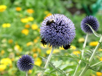 Das Foto gehört zur Serie Blumen im Garten. Es zeigt die Blüte einer Kugeldistel (Echinops ritro). Die Kugeldistel ist eine mehrjährige und anspruchslose Staude. Sie findet man in sonnigen Lagen. Sie ist eine Bienenpflanze. Hier suchen Erdhummeln nach Nektar. Es gelten die Nutzungsbedingungen der Mediothek und Pixiothek.