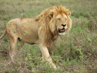 Ein männlicher Löwe in Tansania. Löwen gehören zur Ordnung Raubtiere (Carnivora), zur Überfamilie Katzenartige (Feloidea) und zur Familie Katzen (Felidae).