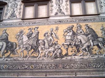 Das Foto gehört zur Serie "Dresdener Fürstenzug". Es zeigt den Abschnitt 1532 bis 1586 - Friedrich der Großmütige, Georg der Bärtige, Heinrich der Fromme, Moritz, August. Der Fürstenzug in Dresden ist das Bild eines Reiterzuges, aufgetragen auf rund 23.000 Fliesen aus Meißner Porzellan auf der Außenwand des Stallhofs in der Augustusstraße. Das 102 Meter lange Kunstwerk stellt die Ahnengalerie der zwischen 1127 und 1873 in Sachsen herrschenden Markgrafen, Herzöge, Kurfürsten und Könige aus dem Geschlecht des Fürstenhauses Wettin dar. Es gelten die Nutzungsbedingungen der Mediothek und Pixiothek.