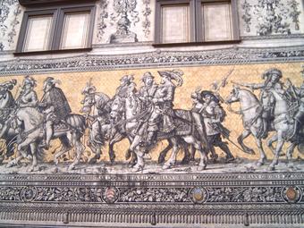 Das Foto gehört zur Serie "Dresdener Fürstenzug". Es zeigt den Abschnitt 1563 bis 1680 - August, Christian I., Christian II., Johann Georg I., Johann Georg II. Der Fürstenzug in Dresden ist das Bild eines Reiterzuges, aufgetragen auf rund 23.000 Fliesen aus Meißner Porzellan auf der Außenwand des Stallhofs in der Augustusstraße. Das 102 Meter lange Kunstwerk stellt die Ahnengalerie der zwischen 1127 und 1873 in Sachsen herrschenden Markgrafen, Herzöge, Kurfürsten und Könige aus dem Geschlecht des Fürstenhauses Wettin dar. Es gelten die Nutzungsbedingungen der Mediothek und Pixiothek.