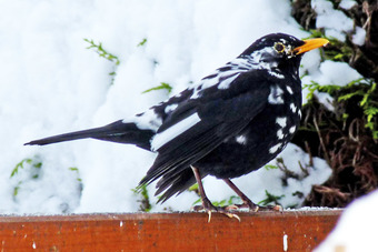 Das Foto gehört zur Serie "Vögel im Winter". Es zeigt ein Amselmännchen. Es gelten die Nutzungsbedingungen der Mediothek und Pixiothek.