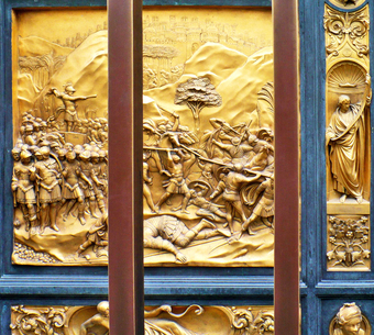 Das Foto gehört zur Serie "Paradiestür am Baptisterium von Florenz". Es zeigt David und Goliath, ein Bronzerelief von Lorenzo Ghiberti. Es ist links in der untersten Reihe der zehn Bildtafeln in seine Paradiestür (auch Paradiespforte genannt) eingebunden. Es gelten die Nutzungsbedingungen der Mediothek und Pixiothek.