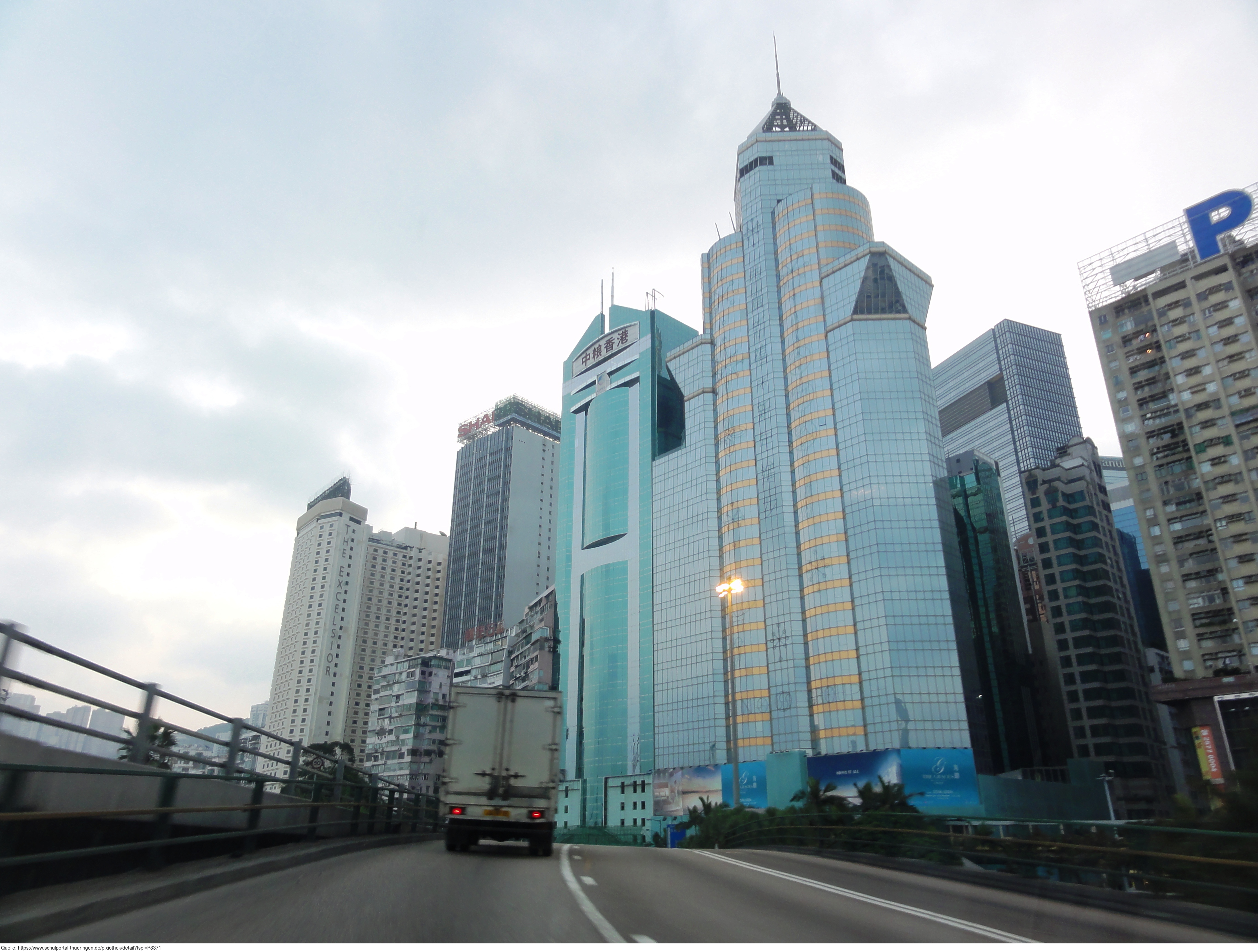 Das Foto gehört zur Serie "Hong Kong Trail". Es zeigt einen Teil der Skyline von Hong Kong, aufgenommen auf der Taxifahrt von Hong Kong Central an die Ostküste nach Tai Long Wan. Es gelten die Nutzungsbedingungen der Mediothek und Pixiothek.