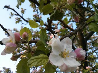 Das Foto gehört zur Serie "Obstbäume". Es zeigt Blüten an einem Apfelbaum. Das Bild ist unter CC0 lizenziert und kann somit frei verwendet werden.