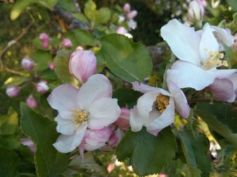 Das Foto gehört zur Serie "Obstbäume". Es zeigt Blüten an einem Apfelbaum. Das Bild ist unter CC0 lizenziert und kann somit frei verwendet werden.