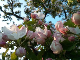 Das Foto gehört zur Serie "Obstbäume". Es zeigt Blüten an einem Apfelbaum. Das Bild ist unter CC0 lizenziert und kann somit frei verwendet werden.