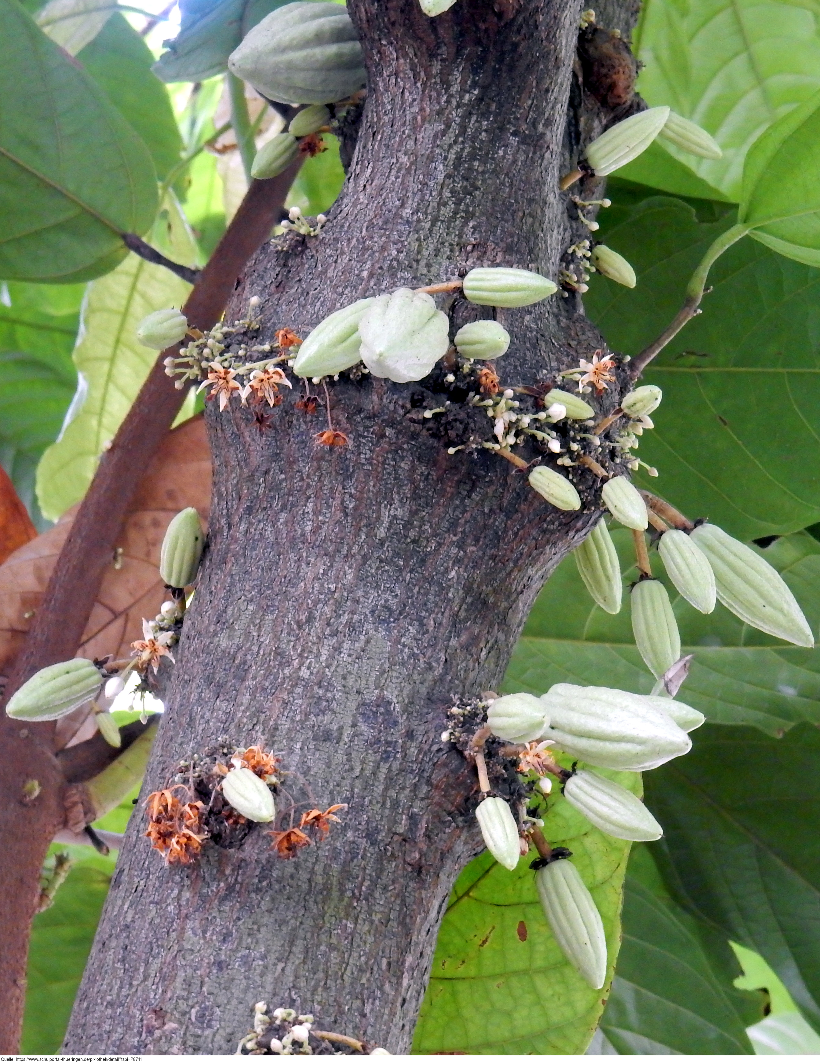 Das Foto gehört zur Serie "Kakao". Es zeigt geschlossene, geöffnete und verwelkte Blüten sowie sich entwickelnde Früchte am Stamm eines Kakaobaums. Das Bild ist unter CC0 lizenziert und kann somit frei verwendet werden.