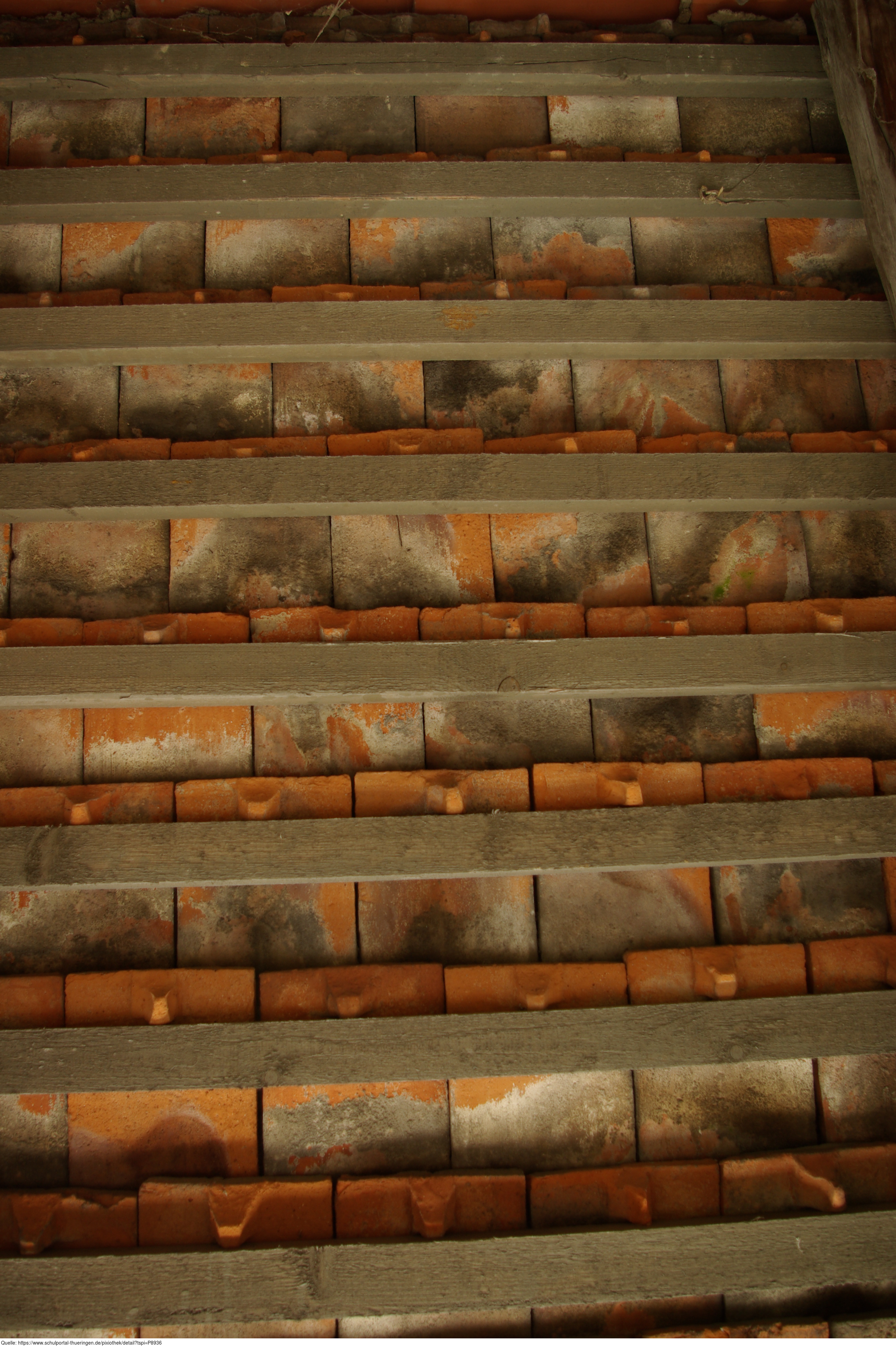 Das Bild gehört zur Serie "Baustoffe". Es zeigt die Innenansicht eines mit Biberschwanzziegeln gedeckten Daches. Das Bild ist unter CC0 lizenziert und kann somit frei verwendet werden.