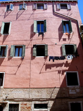 Das Bild gehört zur Serie "Venedig". Es zeigt ein Haus mit rotem Putz und trocknende Wäsche. Das Bild ist unter CC0 lizenziert und kann somit frei verwendet werden.