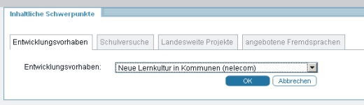 Neben dem Entwicklungsvorhaben "Eigenverantwortliche Schule" ist es im Bereich "Inhaltliche Schwerpunkte" möglich über den Reiter "Entwicklungsvorhaben" und der entsprechenden Auswahltabelle die Teilnahme der Schule an selbigen zu kennzeichnen.