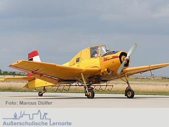 Kurzinhalt: Im Außengelände und im Ausstellungsbereich zur Geschichte der Luftfahrt können die Schüler mit Hilfe von Schautafeln, einem Modell und einer originalen Let Z-37 die Entwicklung des Agrarfluges in Deutschland nachvollziehen. Dazu sind unterschiedliche Aufgabenstellungen möglich, die im Punkt "Inhalt" beschrieben sind.